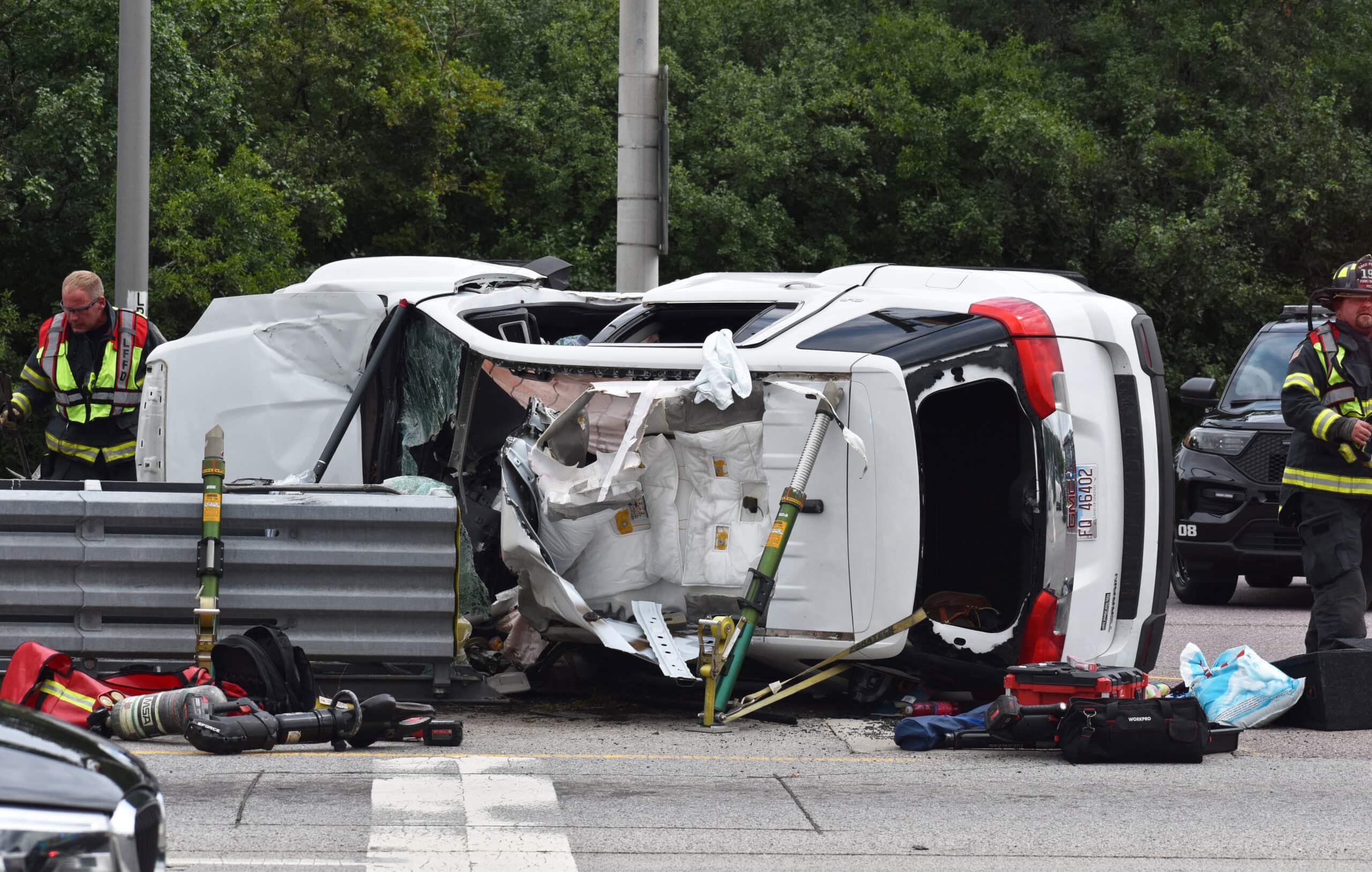 One car was rolled over onto its side, resting against the median along Route 41 at the north side of the intersection.