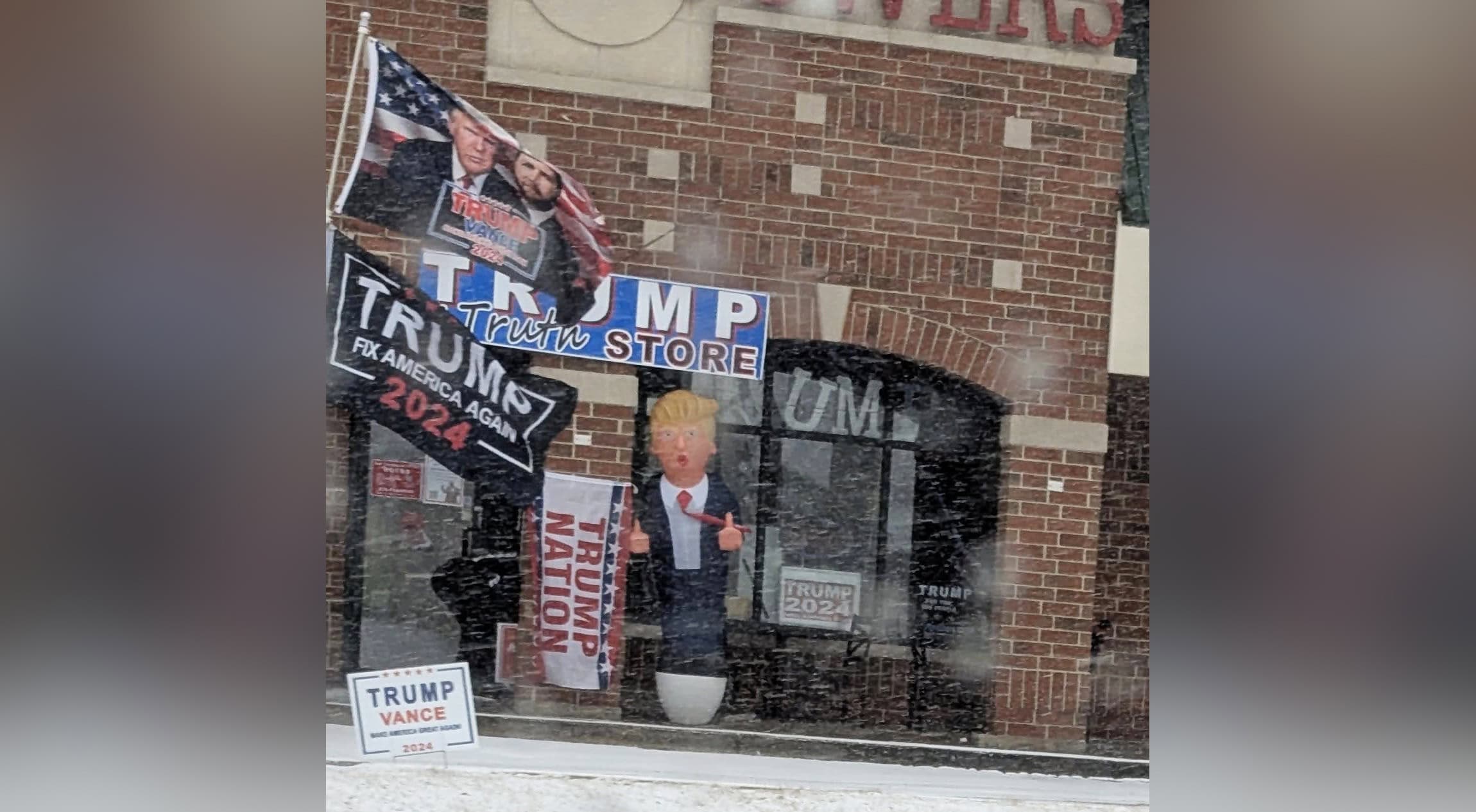 The ordinance complaints say an inflatable figure, a flag installed on the sidewalk, a flag installed on a building column and “Trump and Truth Store” signs and flags installed within the public right-of-way violated Huntley Code of Ordinances.