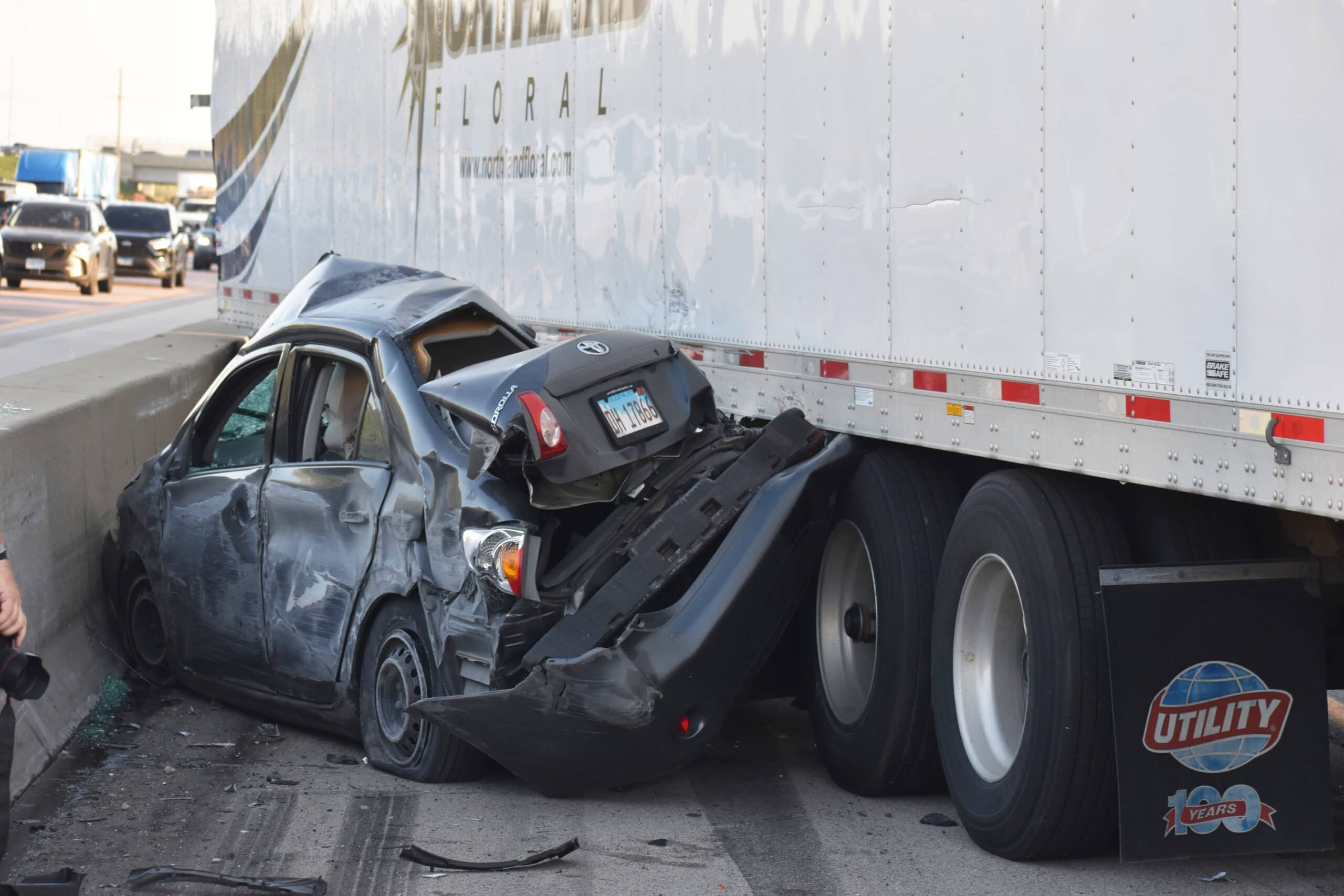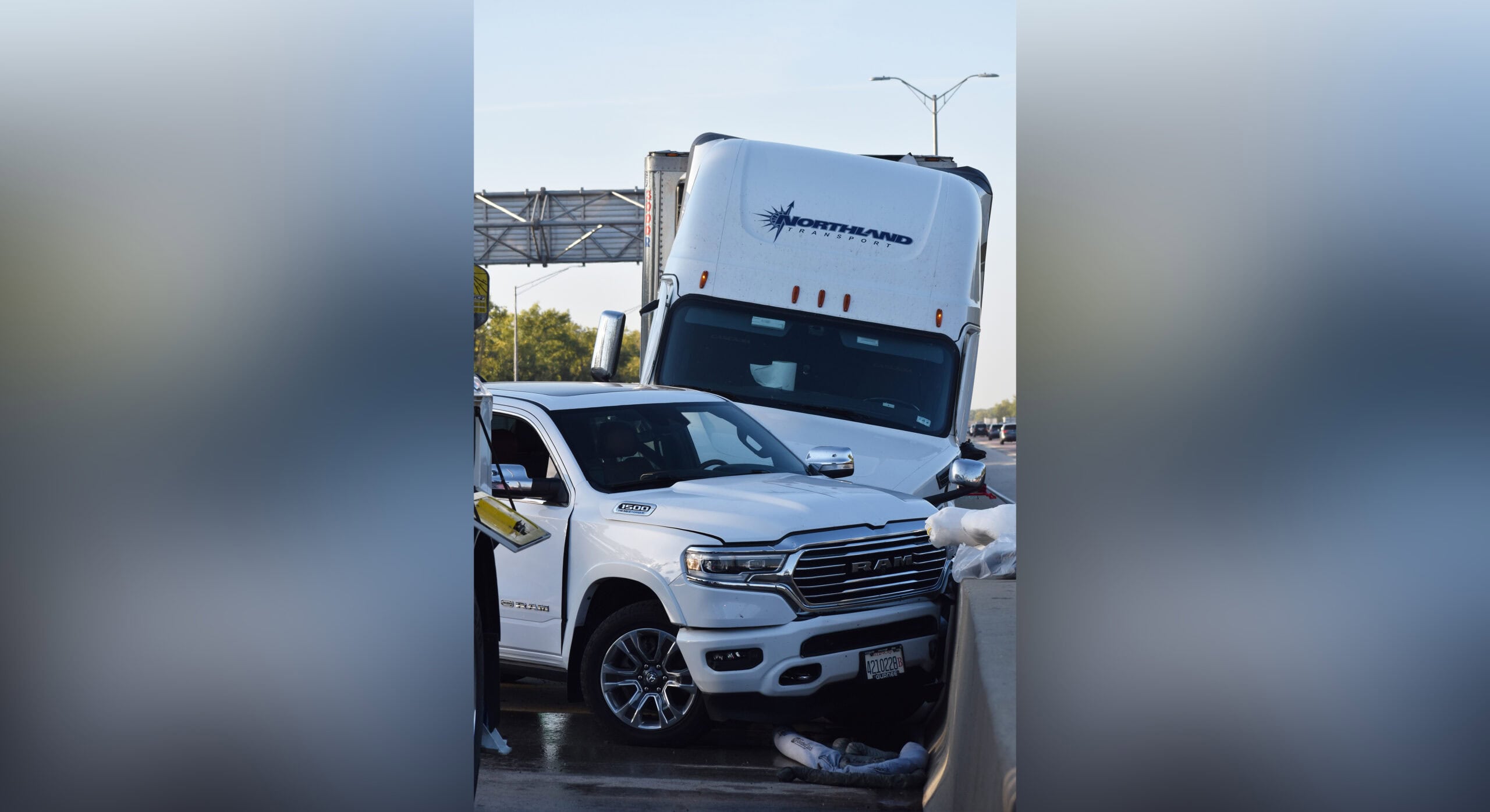 A semi-tractor-trailer truck, a Dodge Ram pickup truck and a Toyota Corolla were involved in the crash, which occurred in the far left lane.
