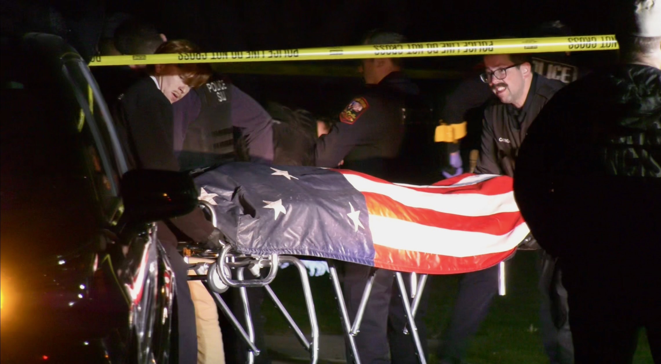 Officials draped a United States flag over the female victim’s body as she was transported from the scene to the coroner’s office.