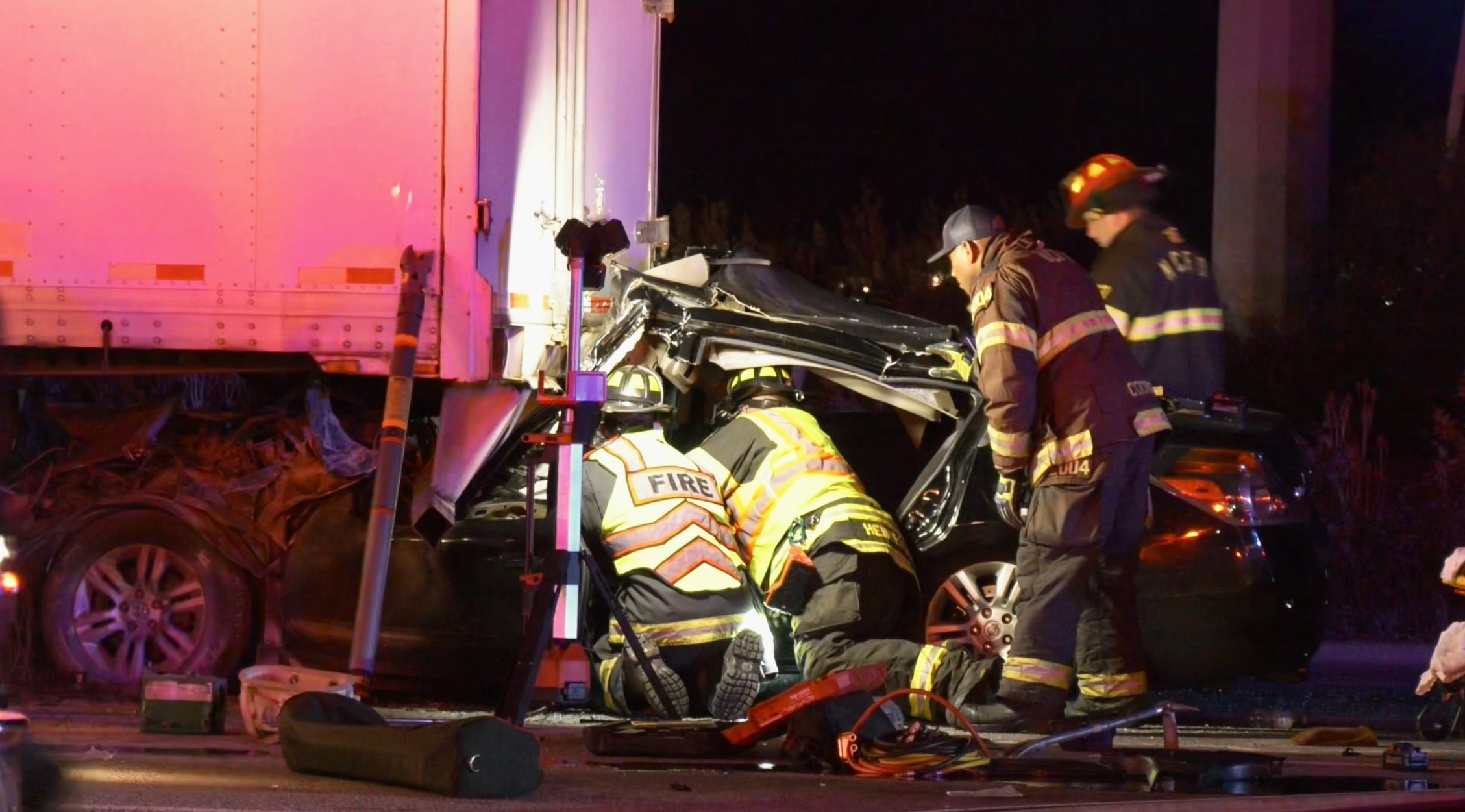 The car, a Nissan Altima, went partially underneath the trailer and sustained significant damage, Umek said. The Nissan also caught fire.