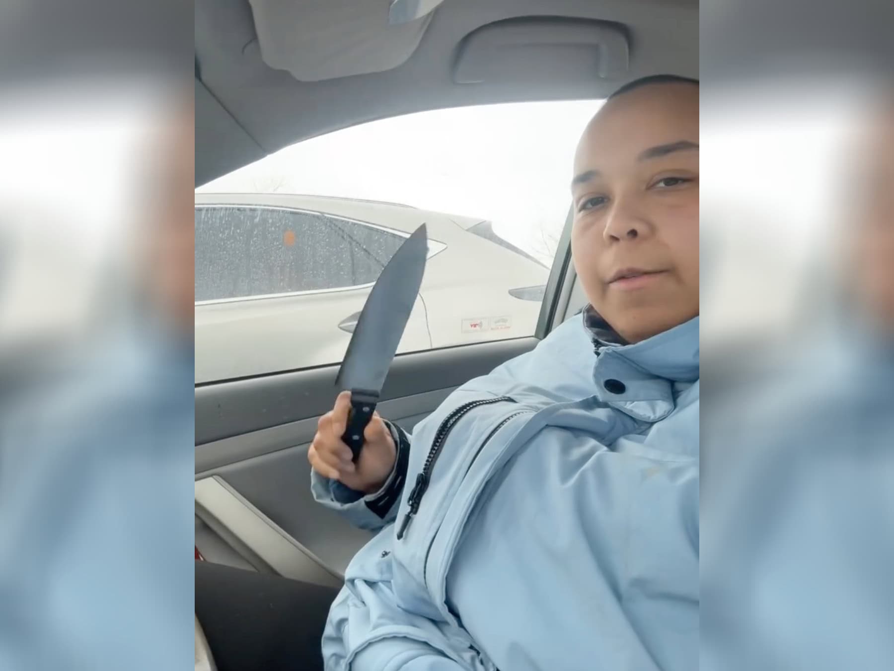 At 10:37 a.m., while continuing to sit in her Toyota, Harmon posted a 19-second video on her profile showing her with a large kitchen knife and bragging about “outsmarting the cops.”
