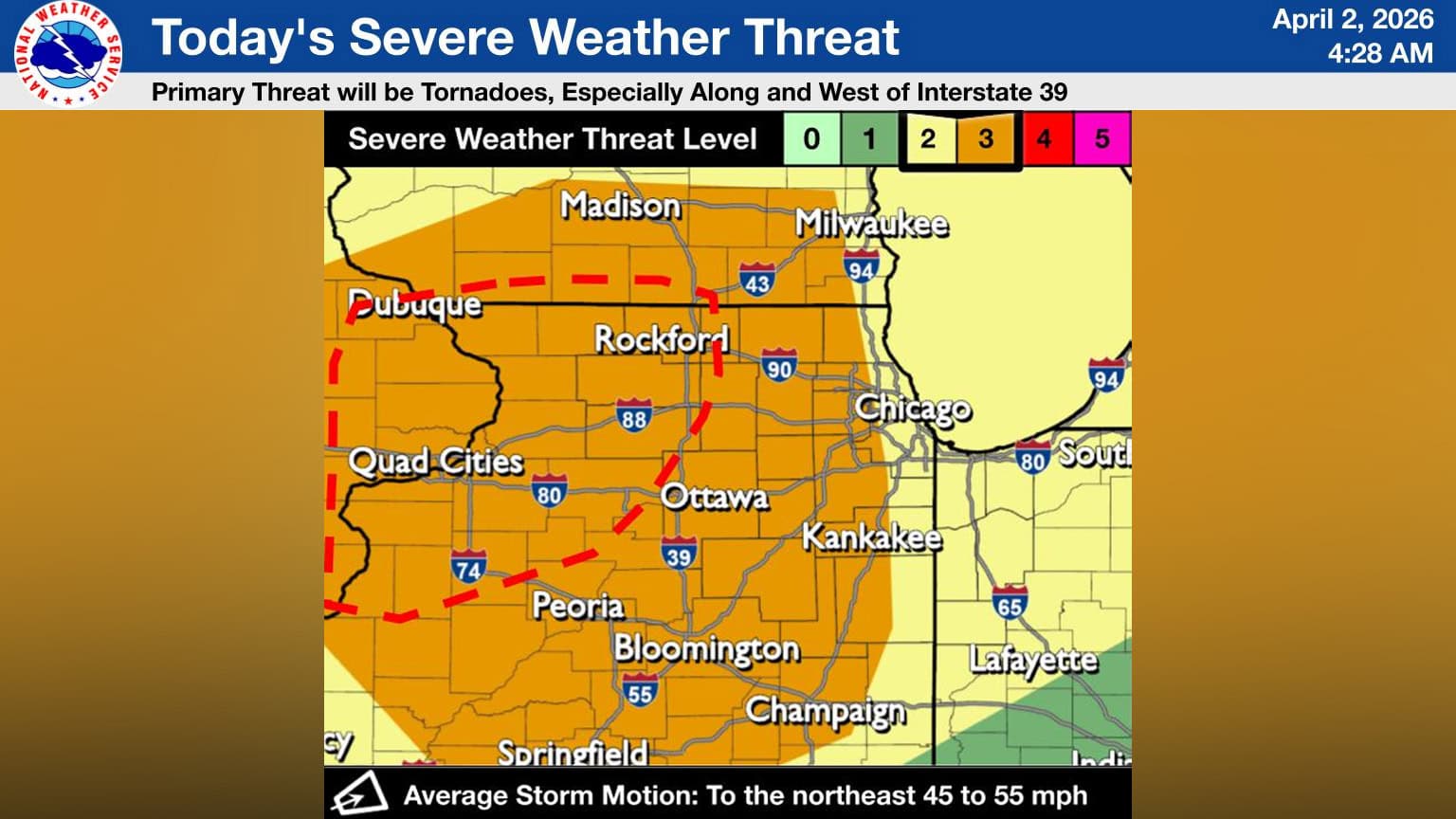 The greatest threat of tornadoes later Thursday will be across northwestern Illinois near Interstate 39 and west.