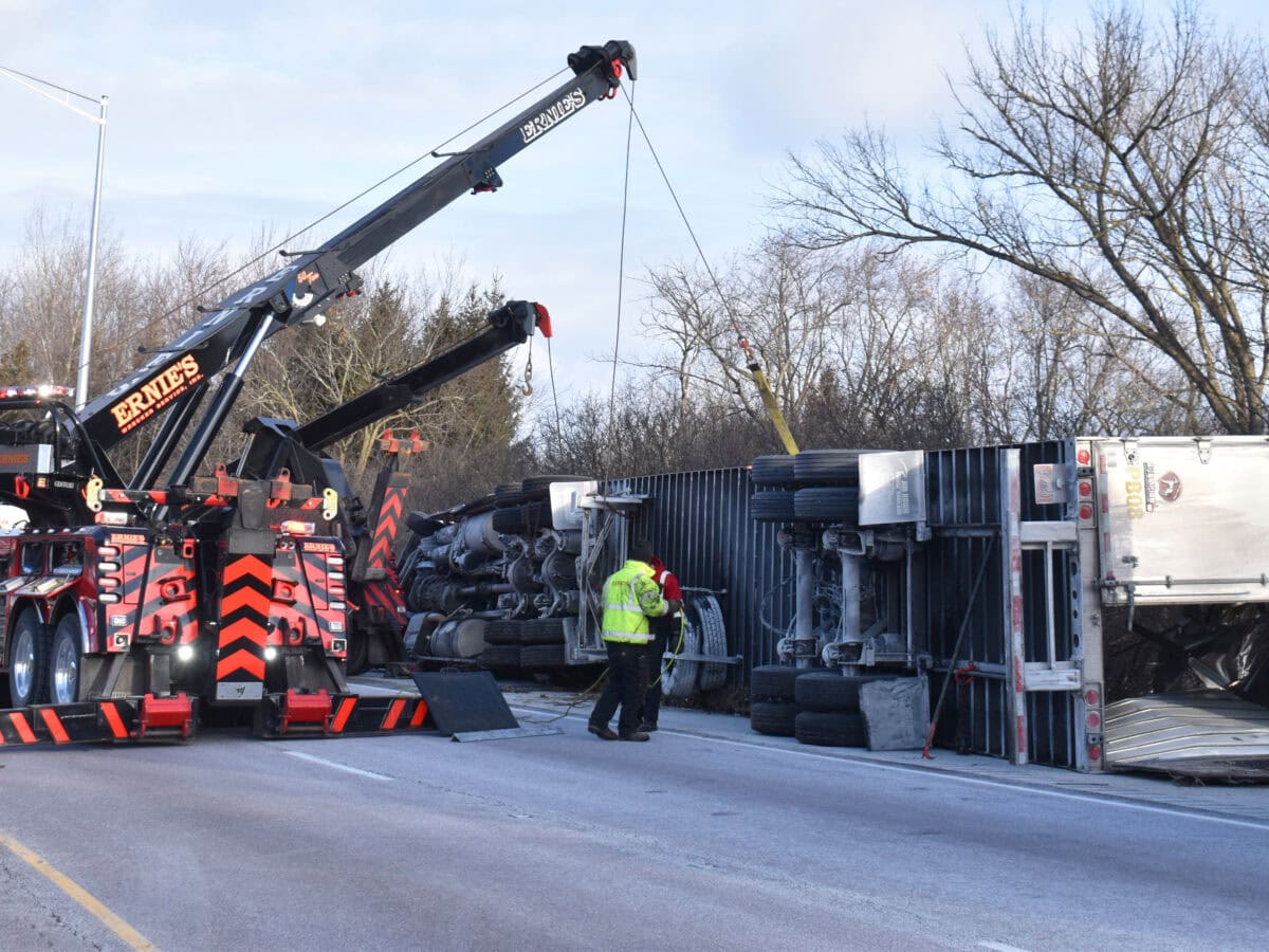 Semi-tractor-trailer truck rolls over, resulting in major damage on Route 41 in Lake Forest